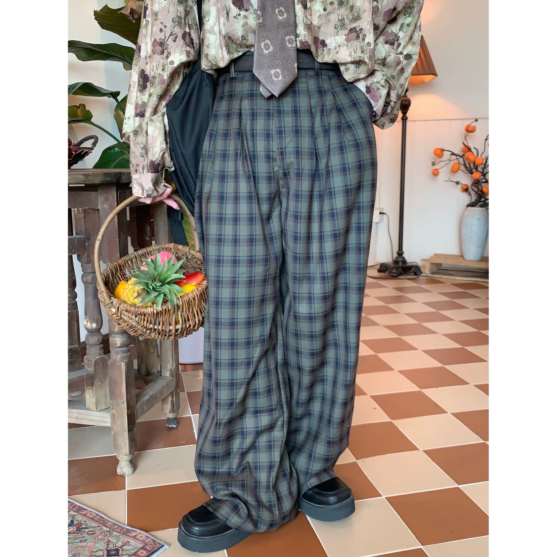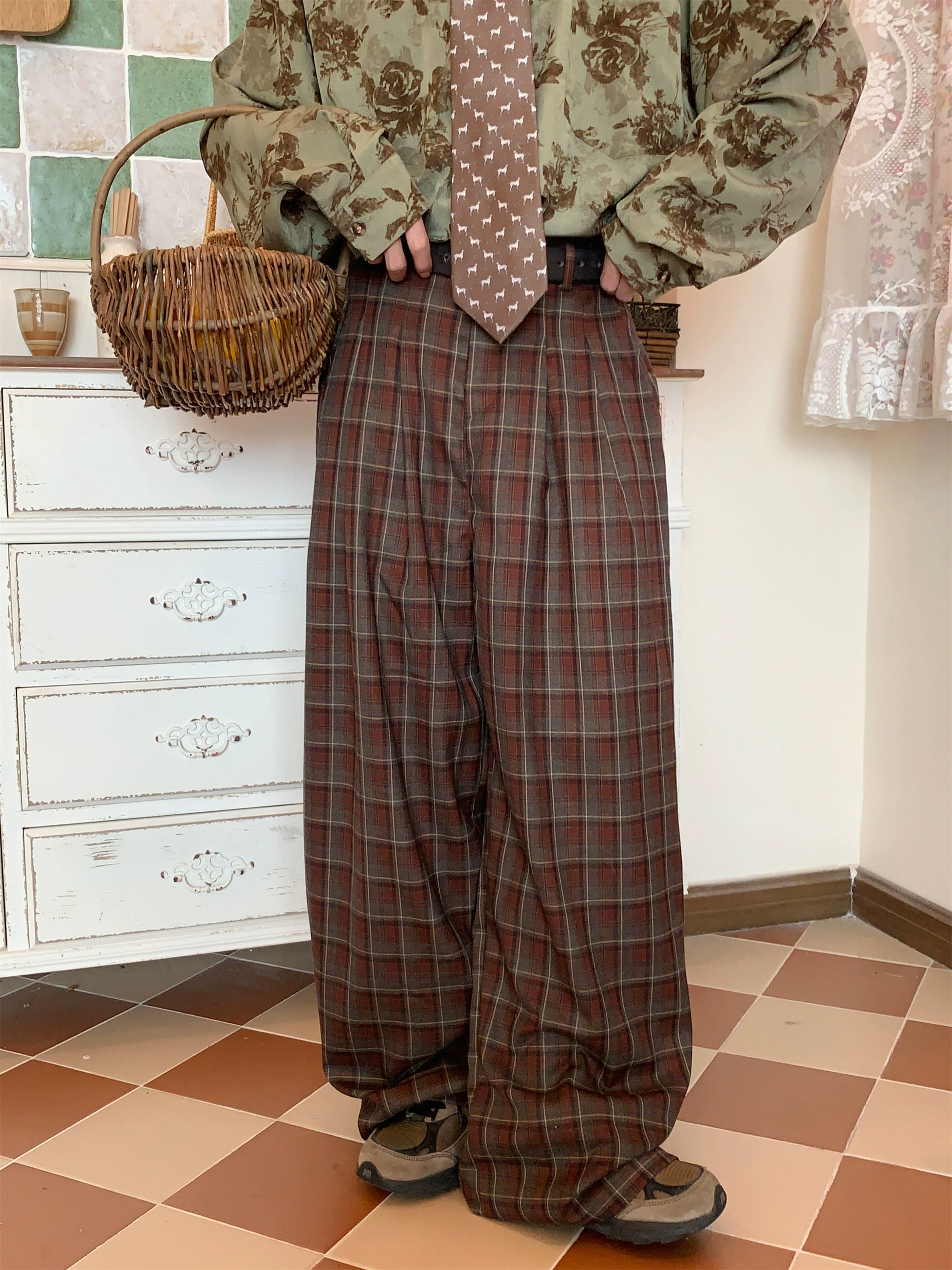 c2 Retro Plaid Straight Wide Casual Pants
